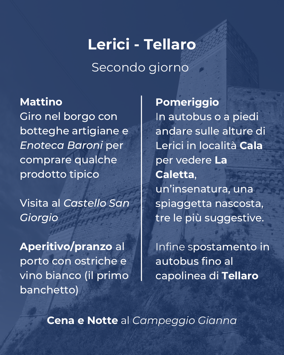 - Primo giorno: arrivo a Lerici, cena di pesce e serata sul mare.