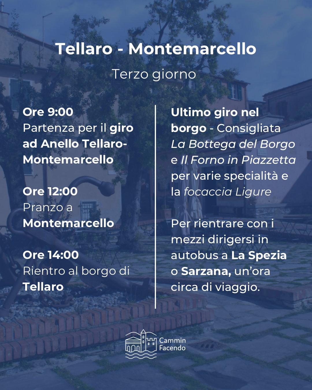 - Terzo giorno: trekking ad anello fino a Montemarcello (uno dei borghi più belli d’Italia) e ritorno tra focaccia e specialità liguri.
